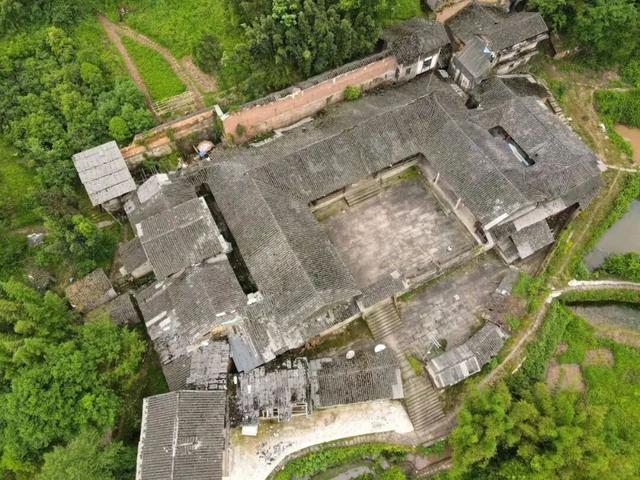 从空中看,整个大院坐南朝北,为两进式四合院布局,左右两座天井。背后还有一段残存的高大外墙,前后各有一碉楼守卫。