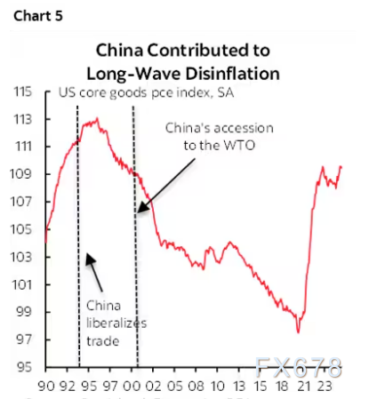 与情形相反的是——若将鲍威尔当前的逻辑套用于历史情境:例如当评论中国上世纪90年代转向制造业出口,及2001年加入WTO,带来的通缩效应时,他很可能宣称这些影响仅会体现在少数通胀报告中,纯属短暂现象。他或许会辩称,关税削减只会产生暂时性影响。而如此一来,他将完全错过如图表5所示的那股长期通缩压力浪潮。