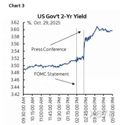 结果是12月会议定价从几乎完全定价的约7个基点变为现在定价降息约16个基点。国债收益率曲线跳涨,2年期收益率较声明发布前上升约9个基点,10年期收益率上升约6个基点。